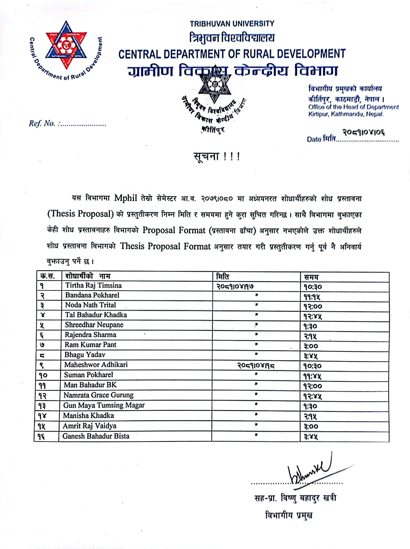 Proposals defence (Viva) program of M.Phil. leading PhD Third Semester (Batch -2022)