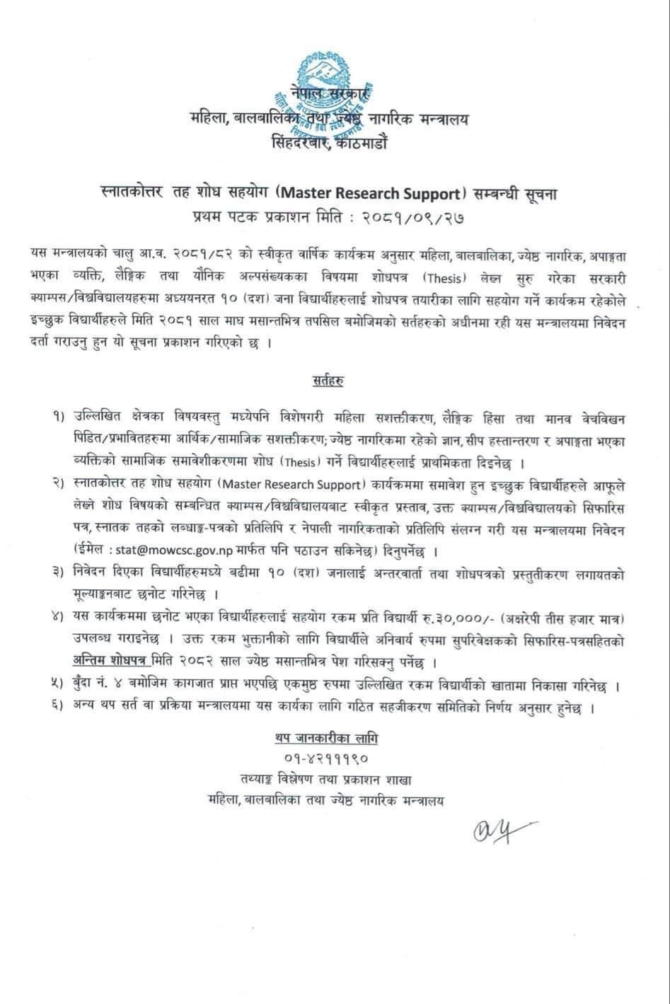 स्नातकाेत्तर तहकाे शाेध सहयाेगसम्बन्धी मन्त्रालयकाे सूचना