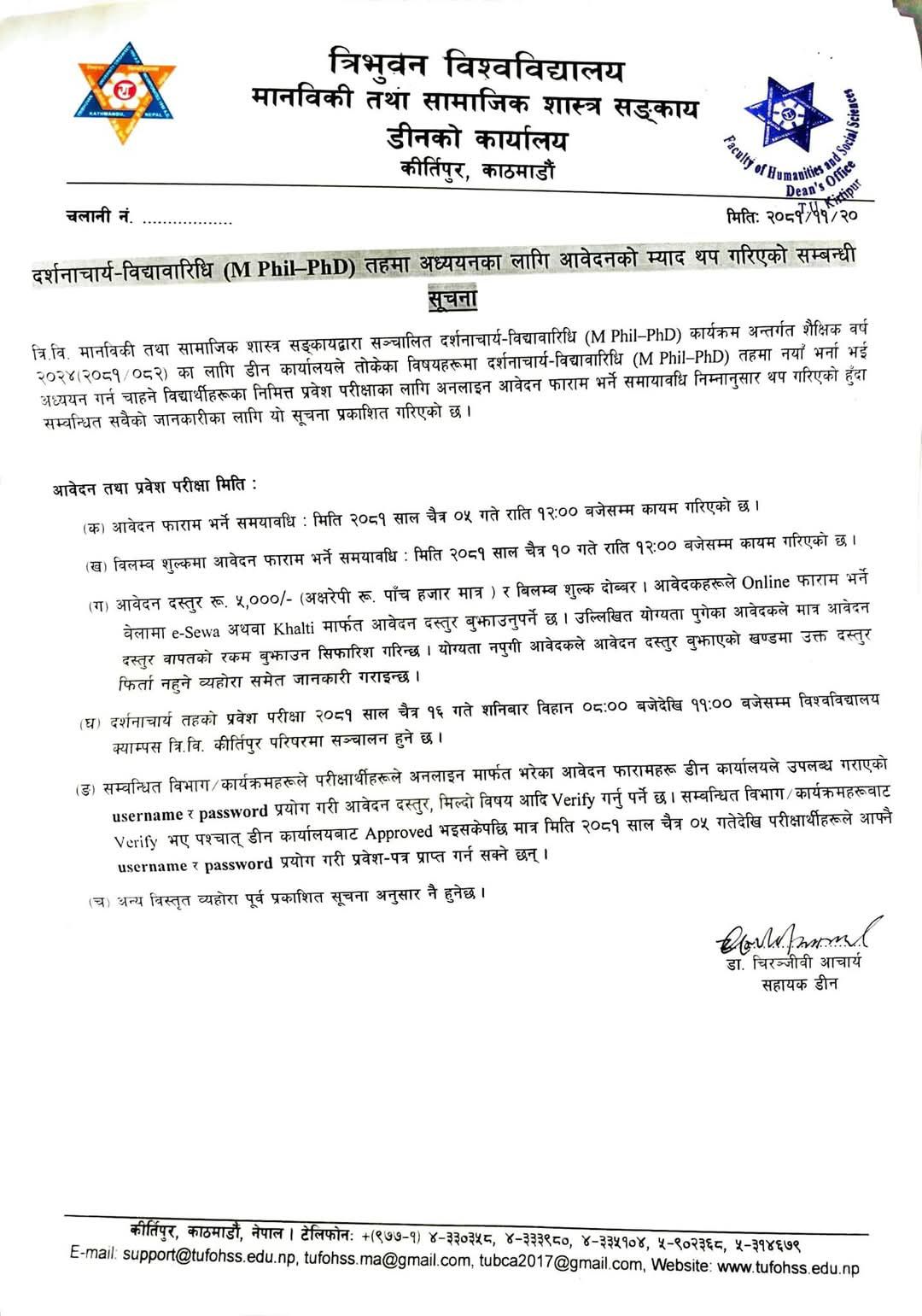 Mphil-PhD २०२४।२५ मा प्रवेश परीक्षा आवेदन फारम भर्ने म्याद थप संबन्धी सूचना